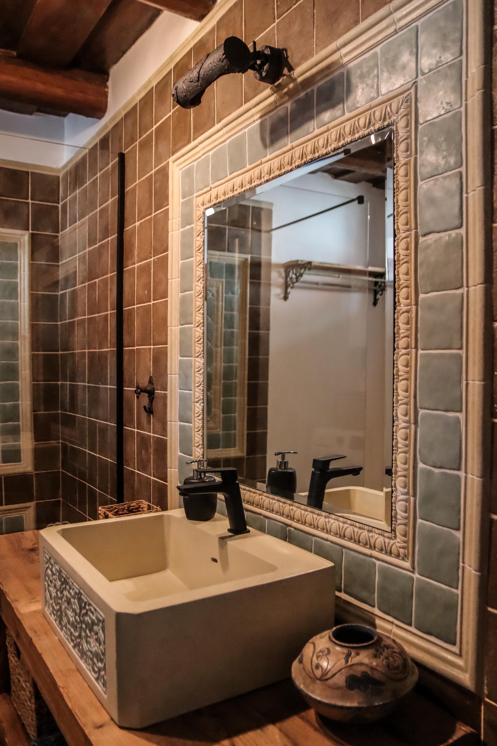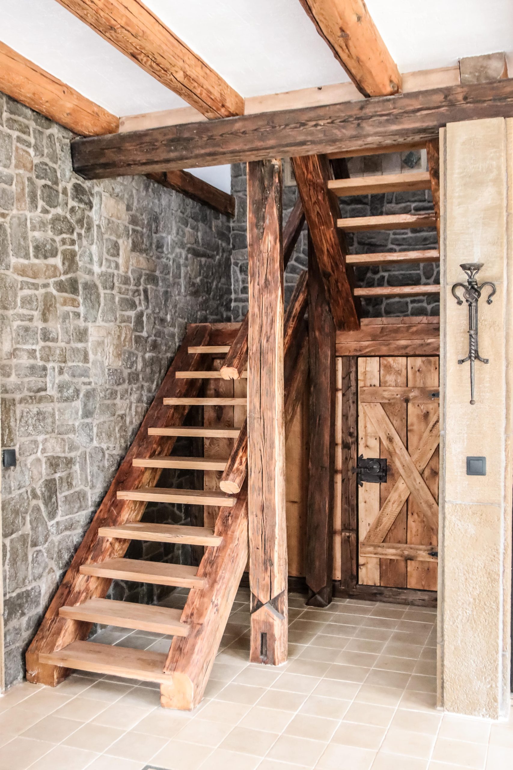 A vályogház felújítása során a természetes anyagok domináltak: bontott fa lépcsők, padlók és egyedi bútorok kerültek beépítésre. A téglaépület falai szintén vályogvakolatot kaptak, amit meszeléssel tettünk még autentikusabbá. A hidegburkolatok az Otti Manufaktúra kézműves termékei, melyek harmonizálnak a természetes anyagokkal, és barátságos, otthonos hangulatot árasztanak.