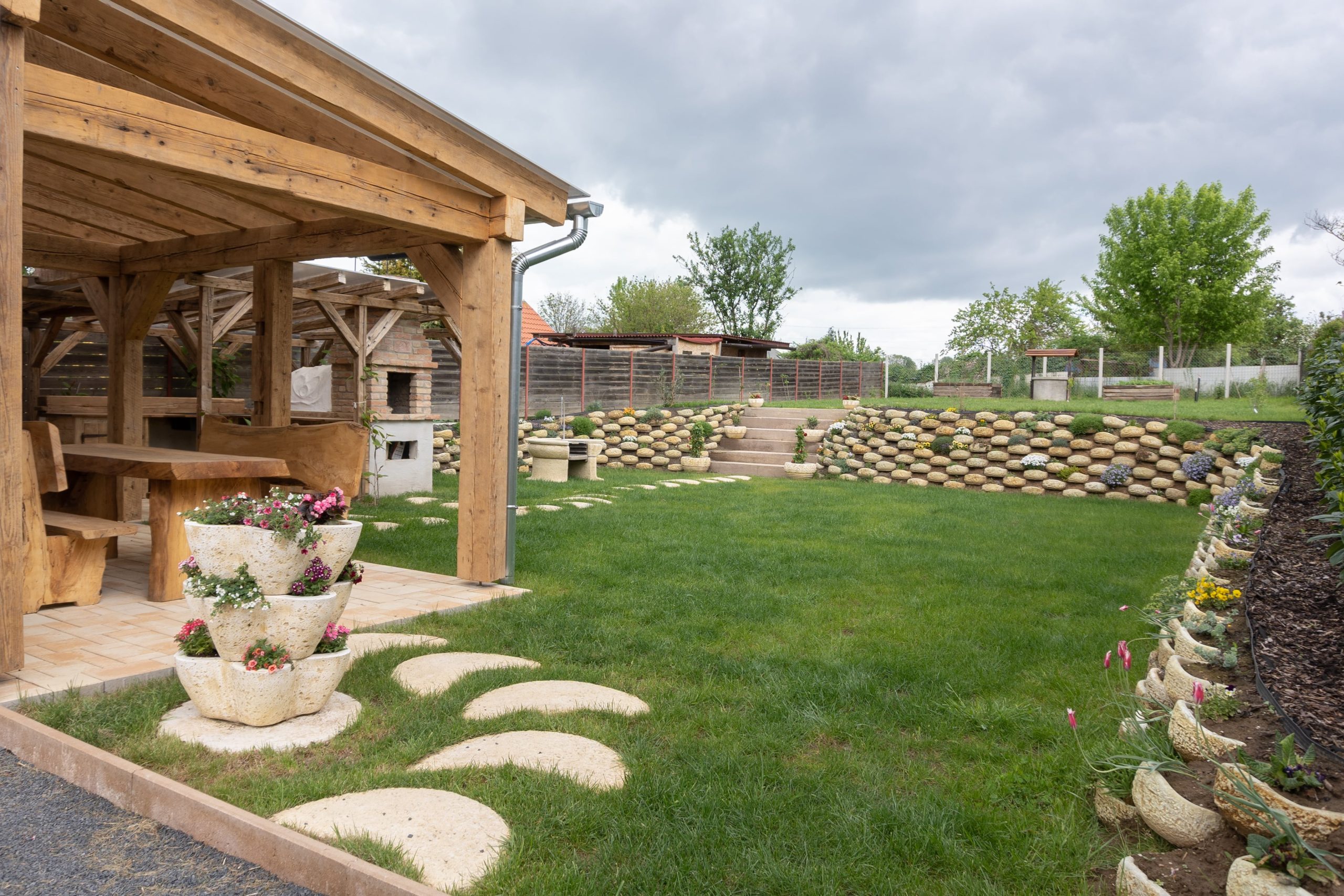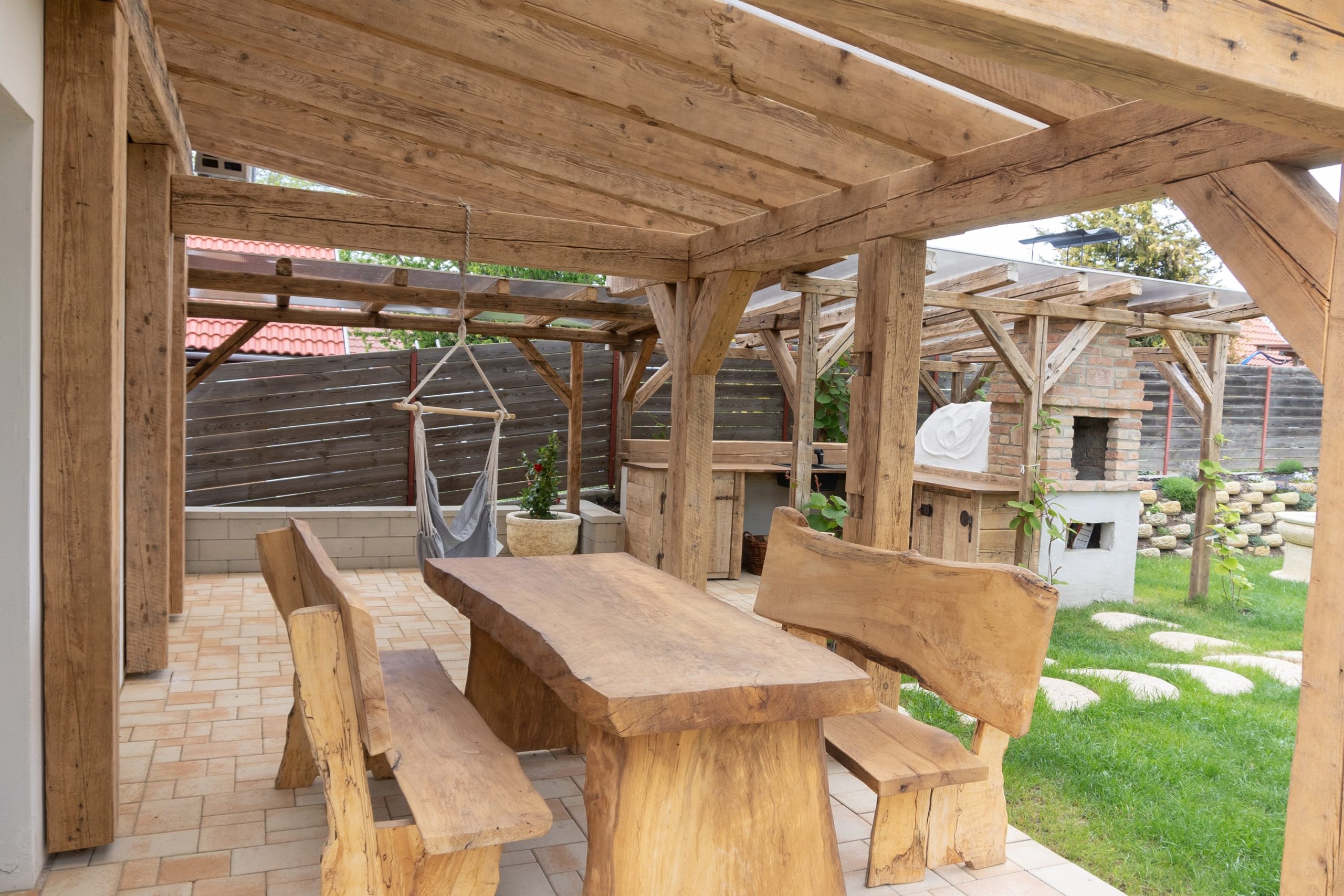 A vendégházhoz tágas, füves kert tartozik, amely ideális a pihenésre és a szabadtéri programokra. A nagy, fedett teraszon kerti bútorok várják a vendégeket, az épített sütögető, kemence és bográcsozási lehetőség pedig a közös étkezések élményét kínálja. A kertben függőszékek és napozásra alkalmas területek is találhatók, így mindenki megtalálhatja a számára tökéletes pihenőhelyet.